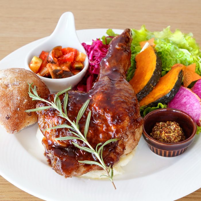 ・グリルチキンのワンプレート(赤ワインソースの信州福味鶏のグリル・マッシュポテト・季節のサラダ・ラタトゥイユ・紫キャベツのマリネ・プチパン・マスタード)